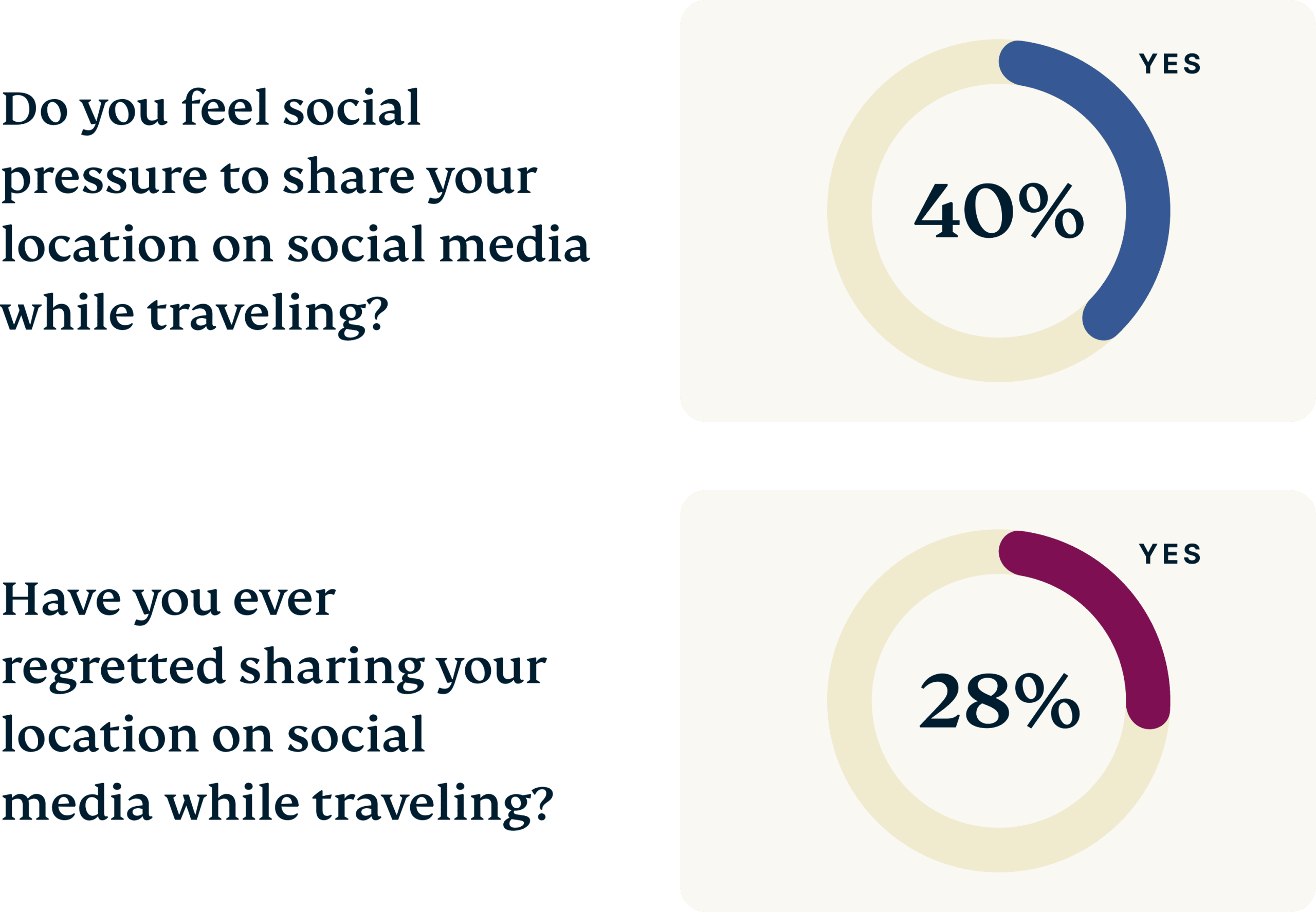 Around 40% of American travelers feel the push to share where they are online, driven by what feels like a modern need to live out loud on social media. But this urge to share comes with some regrets—28% have felt it. Perhaps because the risk wasn't worth the like.