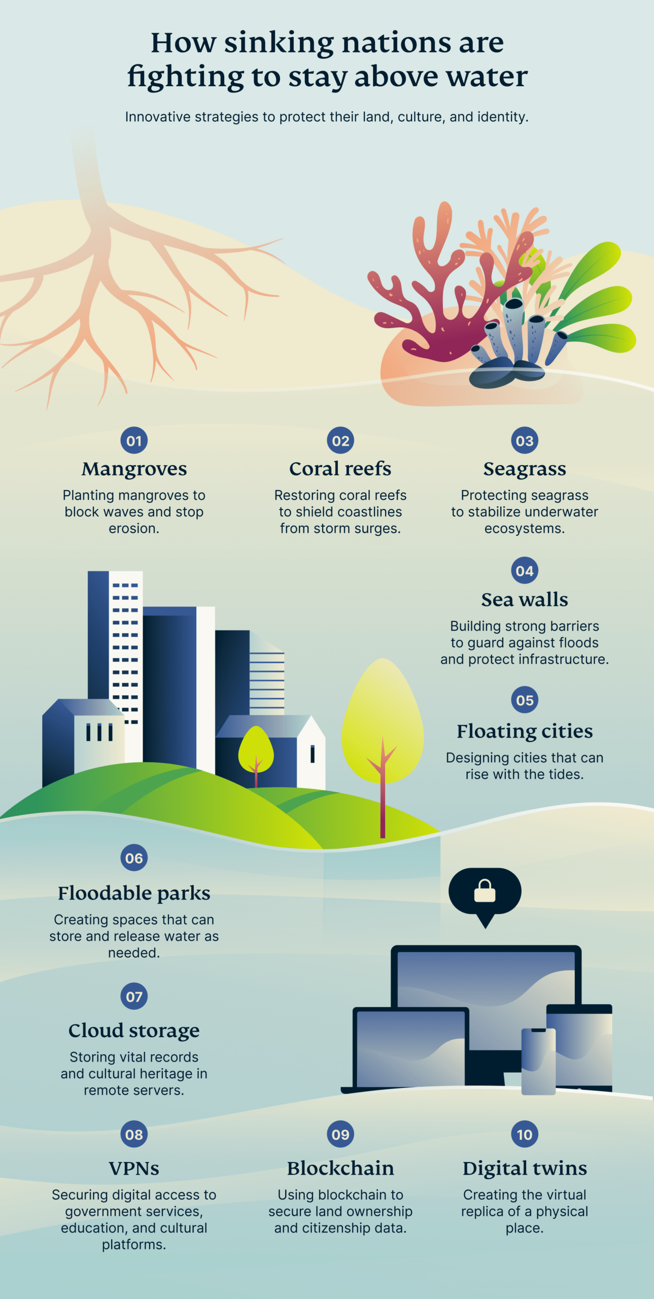 But even as their land erodes and their digital infrastructure falters, these nations are not passively watching their stories slip away. Instead, they are fighting back with extraordinary resilience—through physical defenses to protect what remains and digital strategies to ensure their identities endure, no matter what the future holds.
