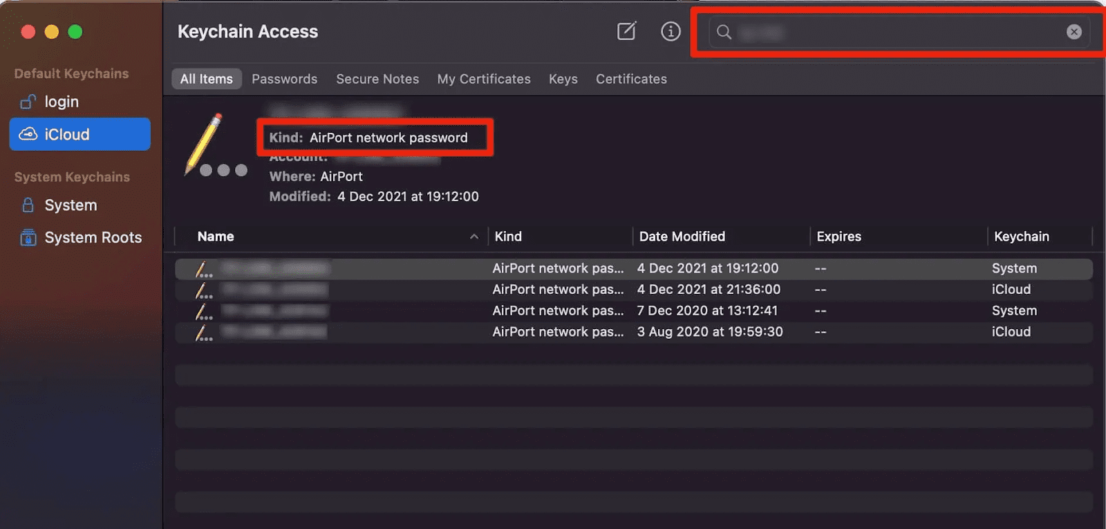 - Within Keychain Access, write the name of the Wi-Fi network you need the password for in the field at the top-right corner of the screen to search for it.