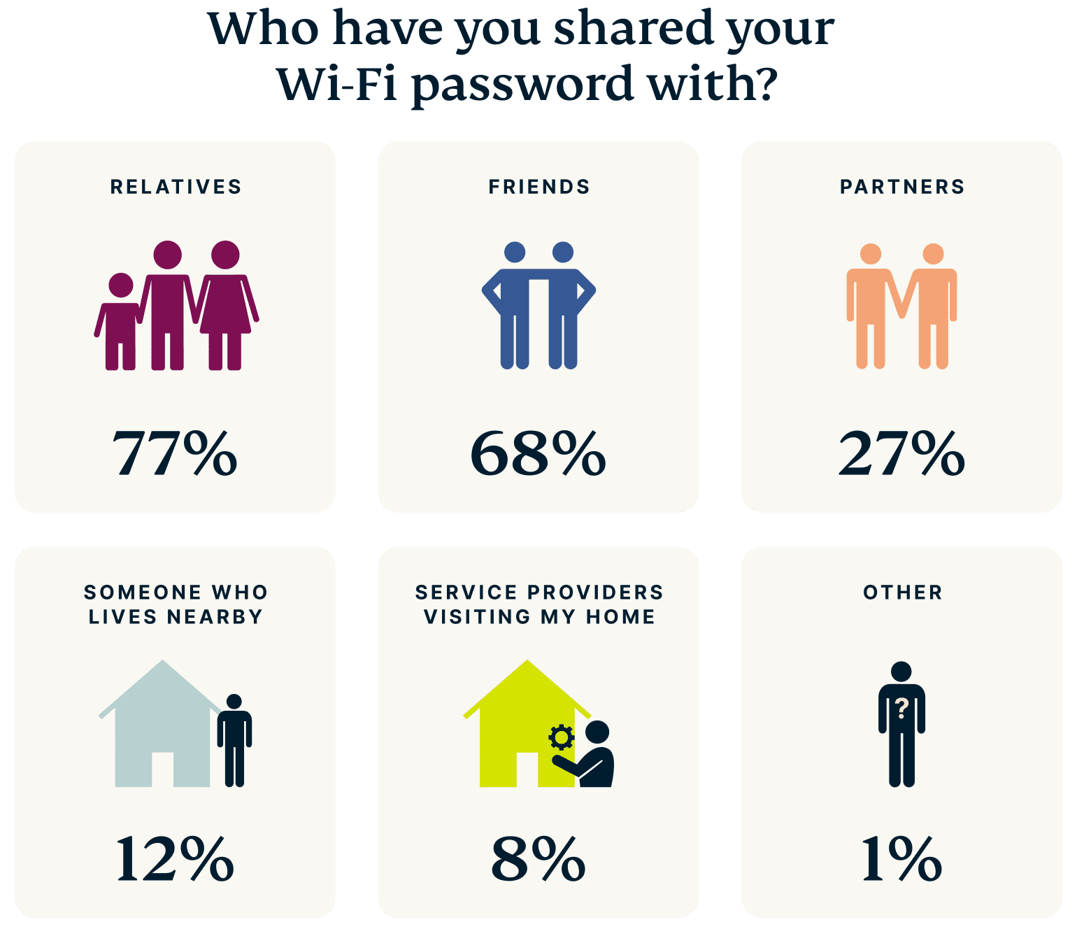 So, who exactly aremore than half of the respondents giving their Wi-Fi passwords to? Our data reveals that individuals are more comfortable sharing their Wi-Fi networks with people they’re close to such as relatives (74%) and friends (57%). Interestingly, only 18% of those surveyed share their Wi-Fi networks with their partners.