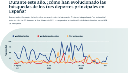 En conclusión, la pasión por el fútbol sigue viva en el público español y es el deporte que más interés genera. No es una sorpresa que la mayoría de datos giren en torno a este deporte. Al mismo tiempo, gracias a Google Trends se puede ver cómo varía el interés de otros deportes en cuanto a búsquedas online. ¿Qué pasa con el tenis desde que tenemos a la “Armada”?, ¿sigue creciendo el interés por el baloncesto? Tanto los grandes eventos como los derechos de transmisión influyen en las búsquedas.