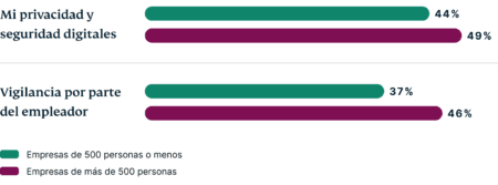 Los empleados de grandes empresas podrían tener motivos para preocuparse, porque las empresas de más de 500 empleados presentaron la mayor probabilidad de monitorear actualmente a sus empleados y que también lo harán en el metaverso. Desafortunadamente, los empleados de estas empresas también son los que presentaron mayor probabilidad de preocuparse por la seguridad digital y la vigilancia de empleados.