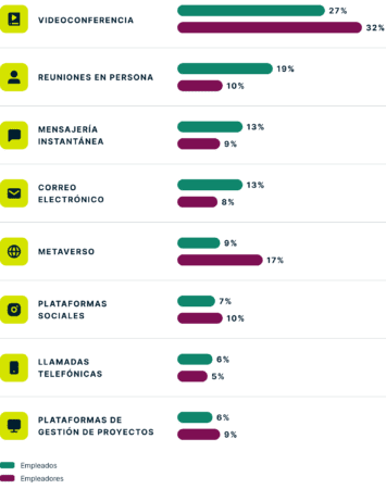 - ¿Quién está interesado? El 77% de los empleadores expresaron interés en un entorno laboral inmersivo como el metaverso, en contraste solo un 57% de los empleados. (Ir a esta sección)
