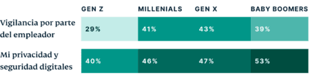 Los integrantes de la generación Z también están probablemente menos preocupados por la vigilancia de los empleadores, la privacidad digital y la seguridad en el metaverso.