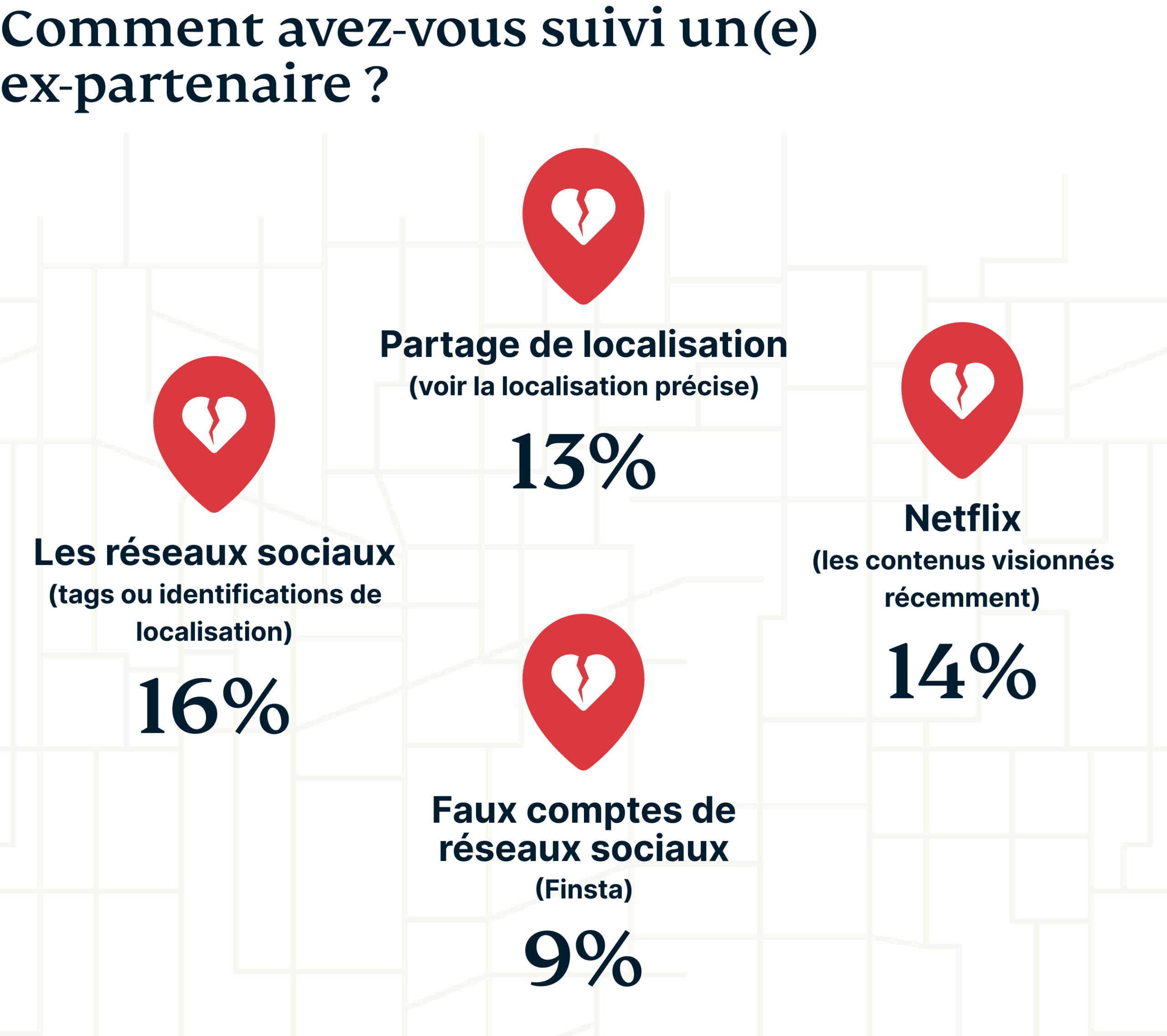 Dans ce que nous considérons comme une découverte inquiétante, 42 % des Français admettent avoir utilisé les nouvelles technologies pour suivre un(e) ex-partenaire (sachez que 30 % des Américains interrogés l'ont également admis).
