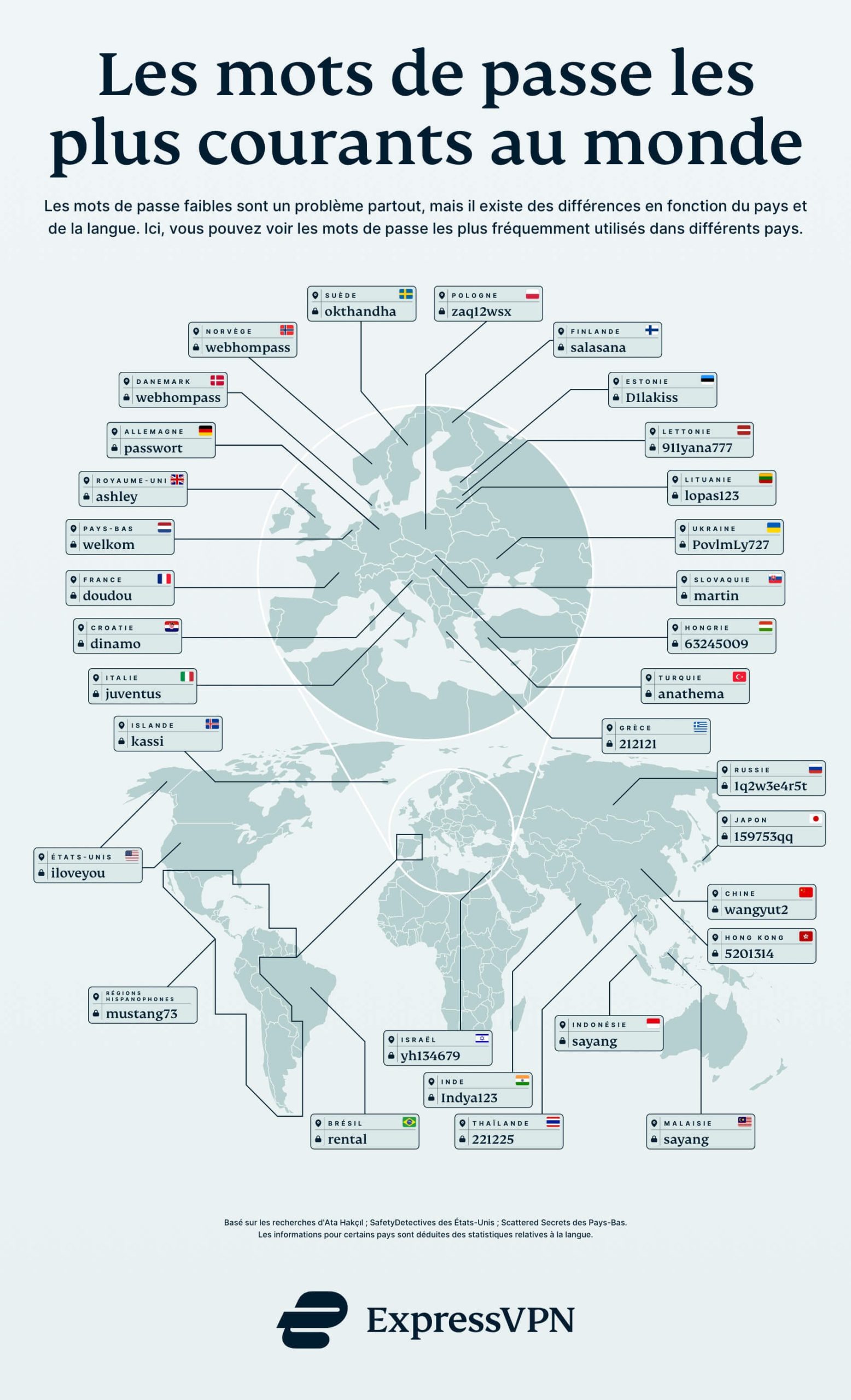 Dans cette présentation, nous avons sélectionné des mots de passe populaires dans différents pays (tous figurent dans le top 10), dont beaucoup sont représentatifs des pays respectifs où ils sont le plus utilisés. Cela montre comment les influences culturelles interviennent dans le choix des mots de passe.