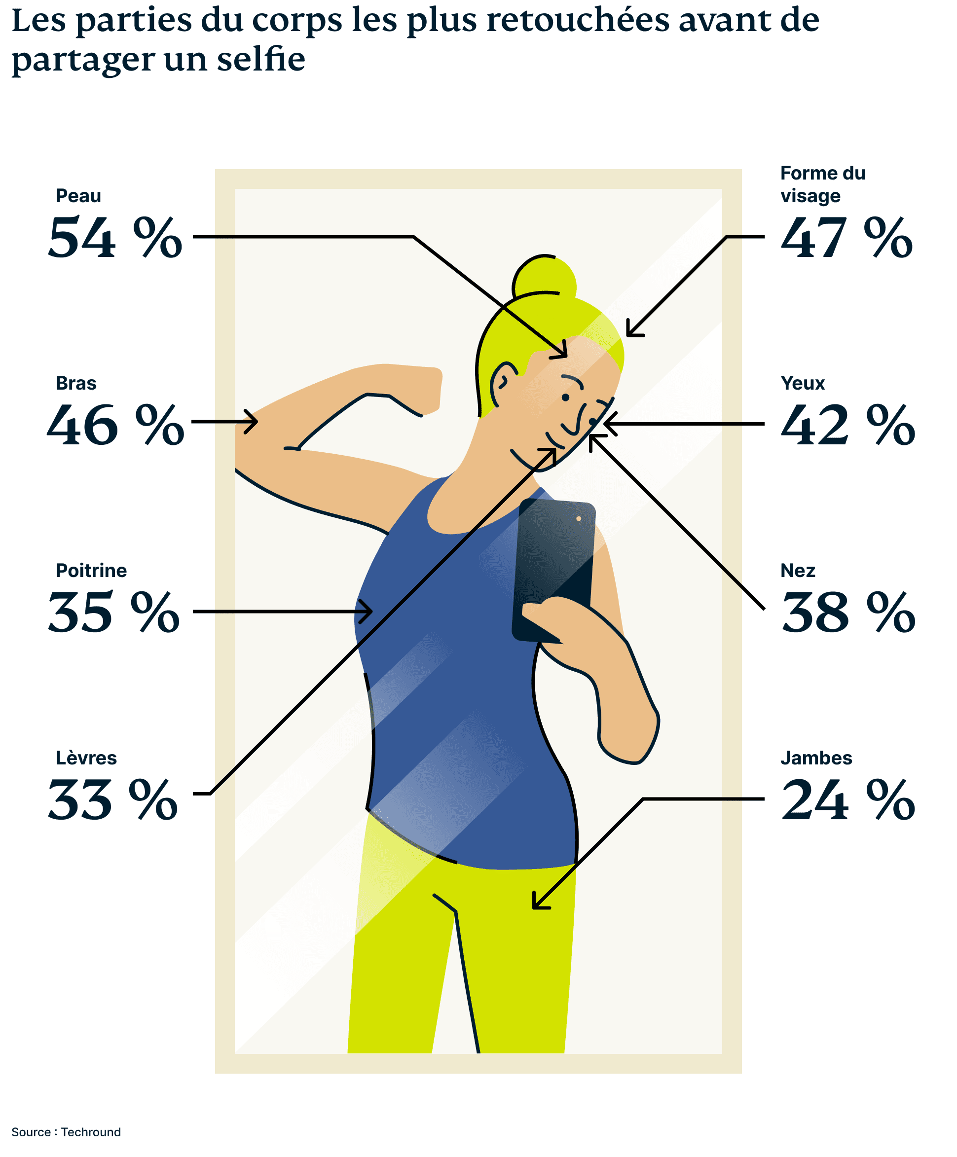 Parmi les personnes qui modifient leurs selfies, environ 8 % utilisent Instagram pour le faire, tandis que deux tiers utilisent l'application Facetune. L’objectif est de dissimuler les imperfections de la peau et de modifier les traits du visage.