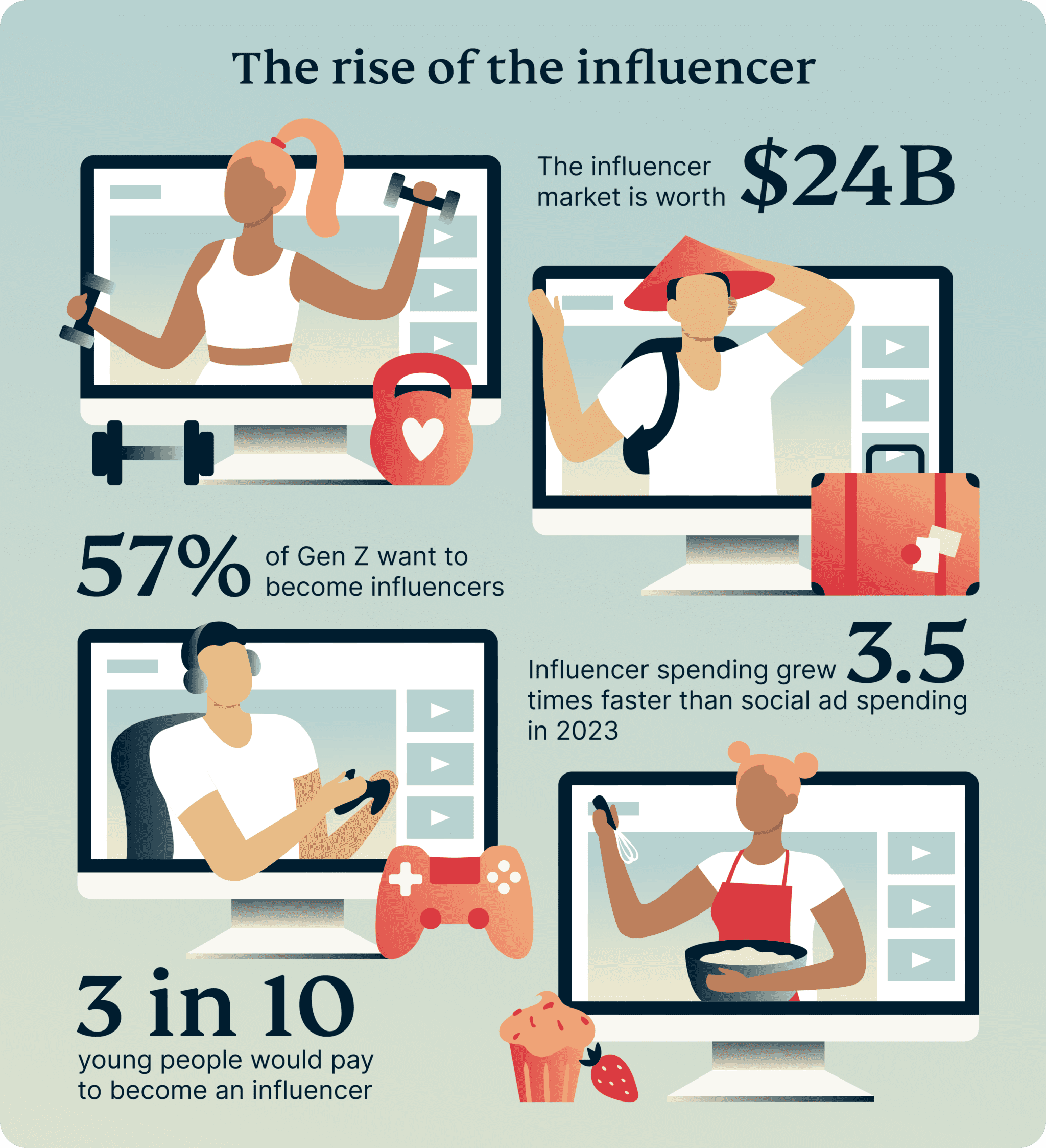Non si tratta solo del trasferimento di denaro pubblicitario da parte dei marchi però. Si tratta di un'intera generazione che vede i social media come un percorso professionale legittimo. Un impressionante 57% della Generazione Z afferma di voler diventare influencer, e 3 su 10 giovani sarebbero persino disposti a pagare per l'opportunità di sfondare online. Non è più solo un progetto parallelo o un colpo di fortuna—è una professione in cui i giovani investono attivamente e che perseguono.
