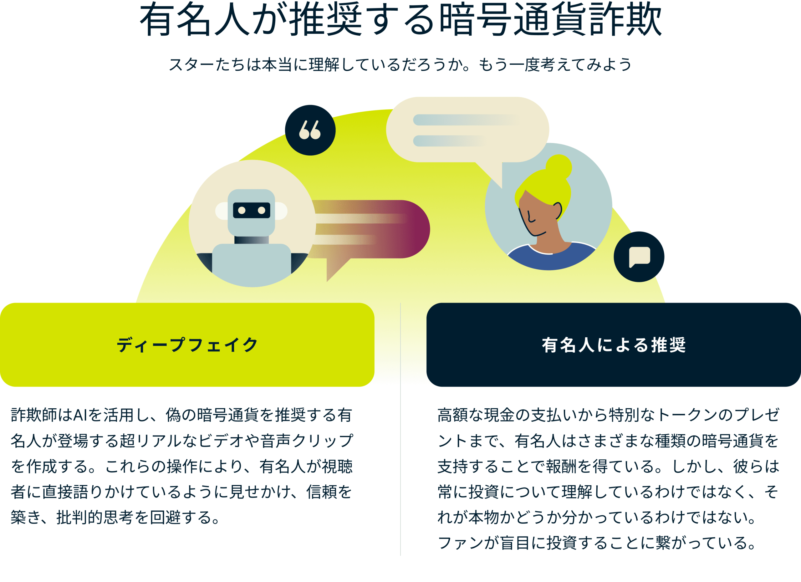 その裏では、有名人がこうしたリスクの高いベンチャーを宣伝するために高額な報酬を得ていることが多く、隠れたリスクや自身の暗号通貨に関する専門知識の欠如を公表することはほとんどありません。有名人がそのプロジェクトを本当に信じていると疑うことを知らないファンを騙すことで、誤った正当性が生み出されます。