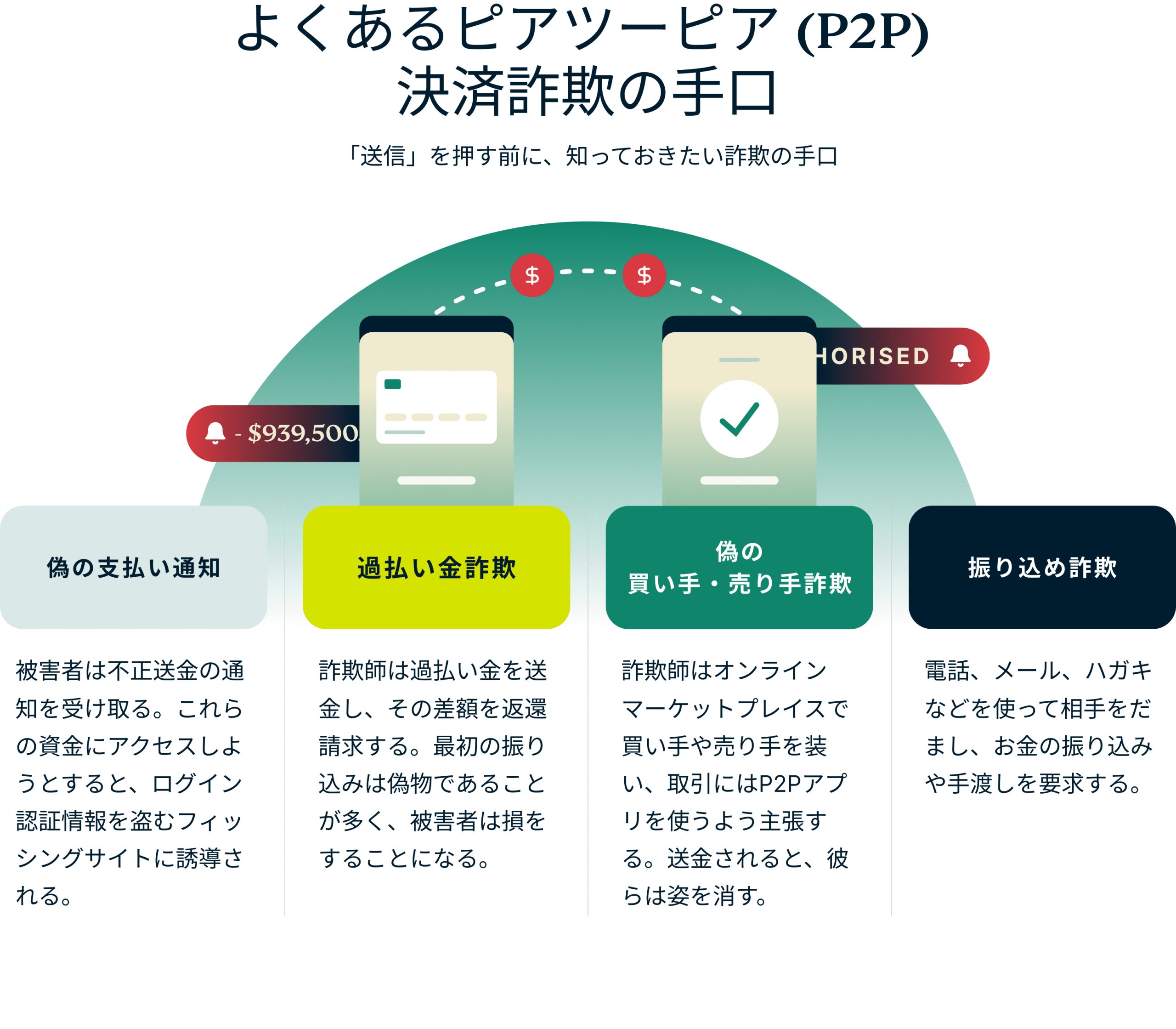 迅速で簡単な取引を可能にするVenmo、Zelle、Cash Appのようなピアツーピア (P2P) 決済アプリは、いつでもどこでも利用可能です。しかし、この利便性が詐欺師を惹きつけ、P2P決済詐欺の増加につながっています。こうした詐欺は通常、ユーザーを騙して送金させたり、詐欺目的で個人情報を漏えいさせたりします。