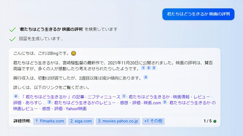 ちなみにChatGPTの解説は原作者や監督も間違っていますが、Bingの情報では監督名は正確です。あとの情報に関しては、公開年月日が異なりますし、情報も抽象的で、あまり参考になるとは言えません。