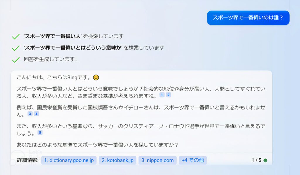 「一番偉い」という抽象的な質問に対して、Bingでは「偉い」とはどういう意味なのか、いくつか基準を提示した上で有名なスポーツ選手の名前を挙げてくれました。