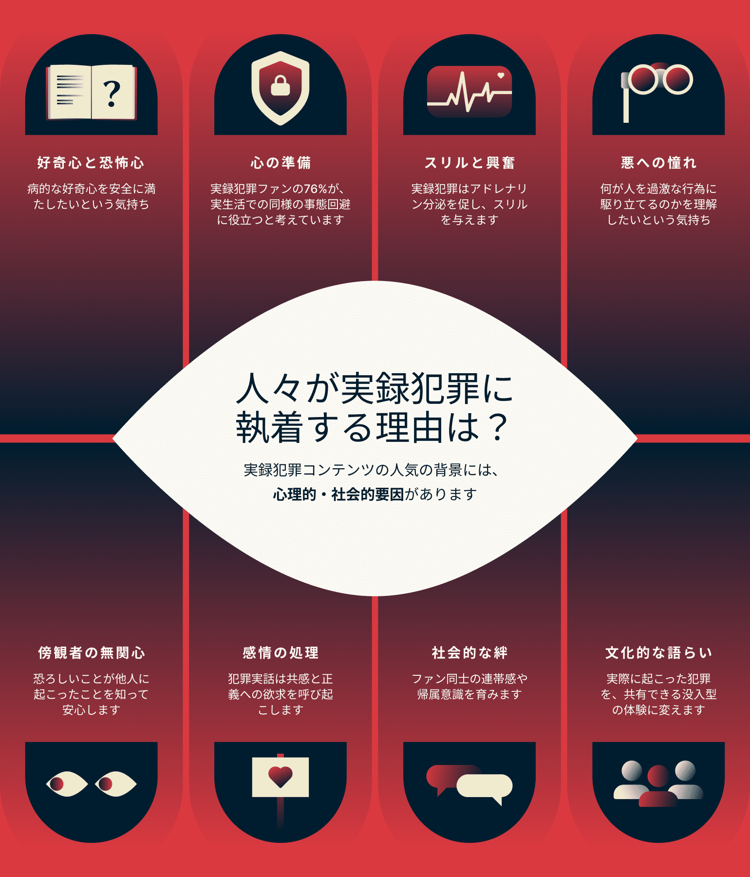 - 好奇心、恐怖への対処、スリルの追求といった心理的要因が、人々の犯罪の実話に対する執着心を駆り立てる