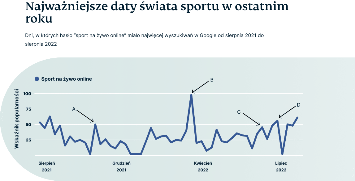 Sprawdziliśmy w Google Trends, w jakie dni najczęściej wyszukiwane było hasło sport na żywo online w ciągu ostatniego roku. Zdecydowanie najpopularniejszą datą okazał się 29 marca 2022 roku (B) – czyli finał baraży o Mistrzostwa Świata 2022: Polska – Szwecja w Katarze.