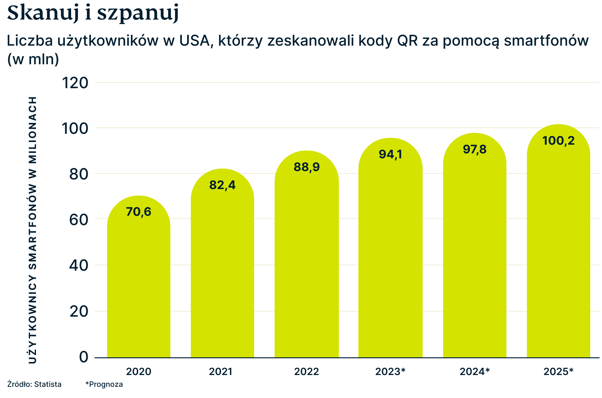 Prawdopodobnie nadal będziemy obserwować, jak – dzięki ich dostępności i łatwości użycia – te małe czarno-białe wzorki wkradają się coraz częściej do naszego życia codziennego. eMarketer przewidział, że liczba skanów kodów QR wzrośnie o 19% do 2035 roku w porównaniu ze statystykami  z 2022 roku, kiedy oczekiwana liczba skanów miała wynieść 100 milionów.