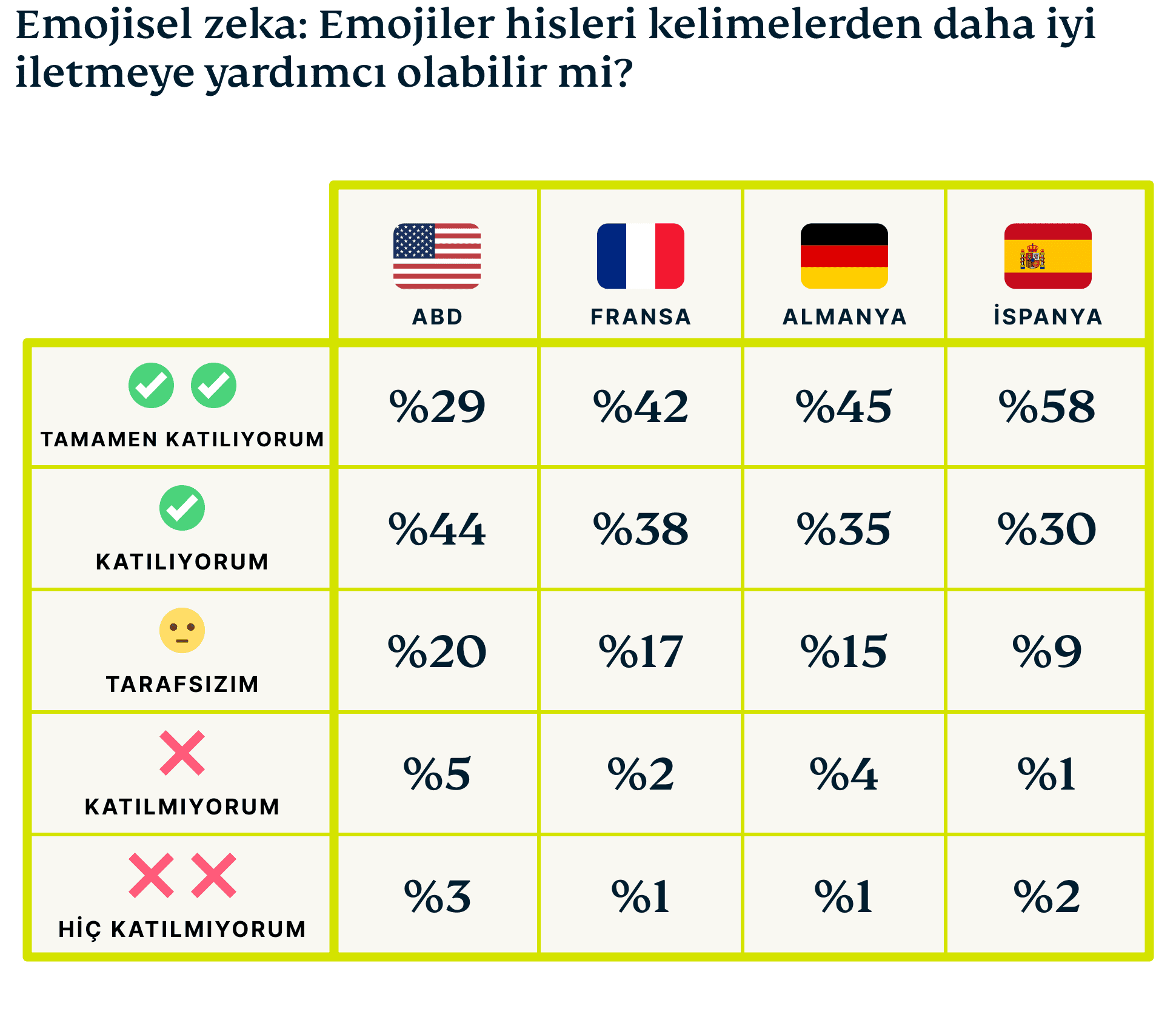Amerikalıların yarısından fazlası (%51), emojilerin kötü haberleri yumuşattığına inanmıyor. Bu görüş Fransa, Almanya veya İspanya’da belirtilenlerden daha yaygın. Buna rağmen, yarısından fazlası nasıl hissettiklerini gizlemek için emojileri kullandığını da belirtti.