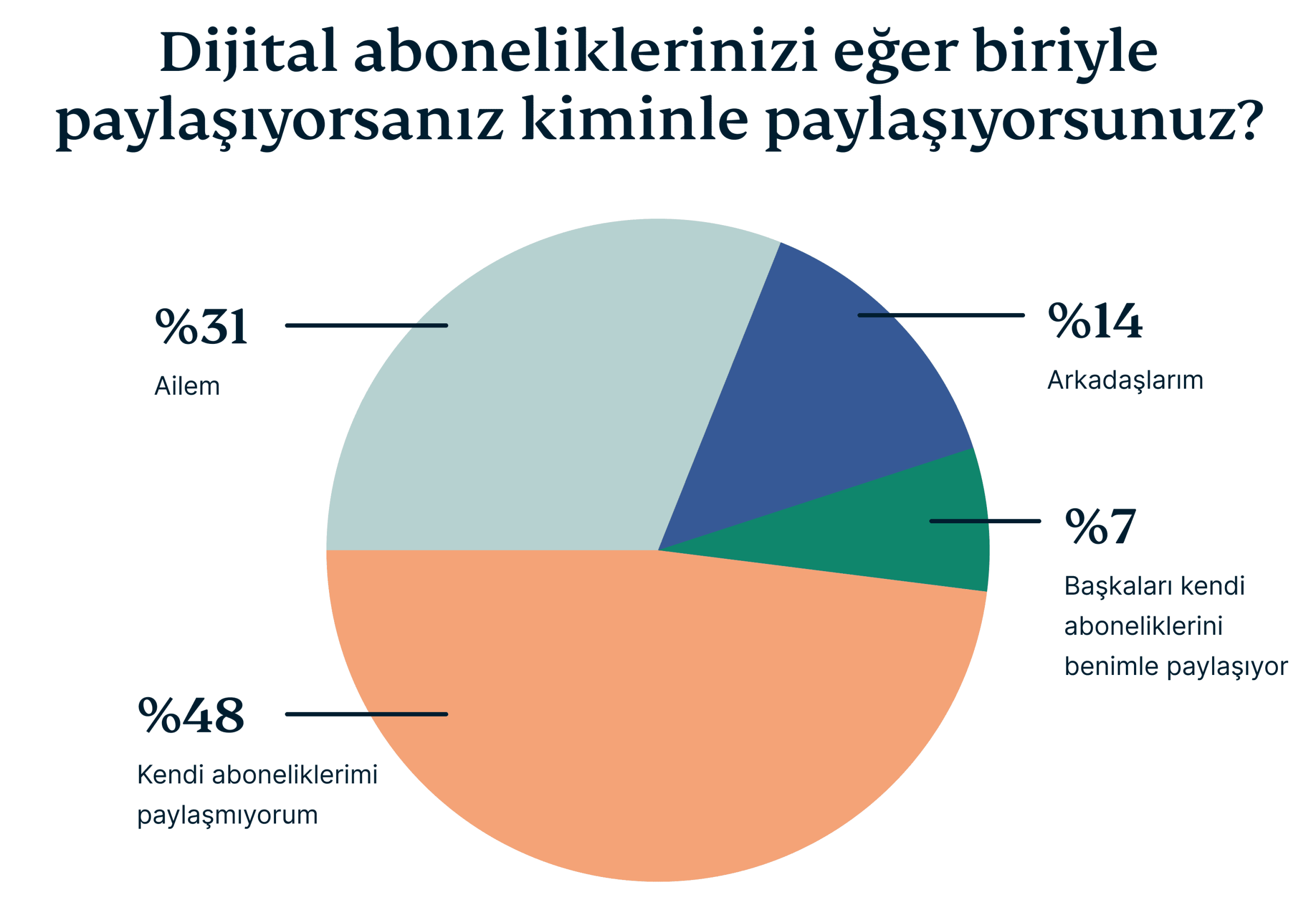 Anketimize göre, insanların %31’i dijital aboneliklerini aile üyeleriyle paylaşırken, %14’ü bu paylaşımı arkadaşlarına kadar genişletiyor. Diğer yandan, %7'lik bir kesim başkaları tarafından ödenen abonelikleri kullanıyor. Bu, kullanıcıların neredeyse yarısının bir şekilde abonelik paylaşımında bulunduğunu gösteriyor.