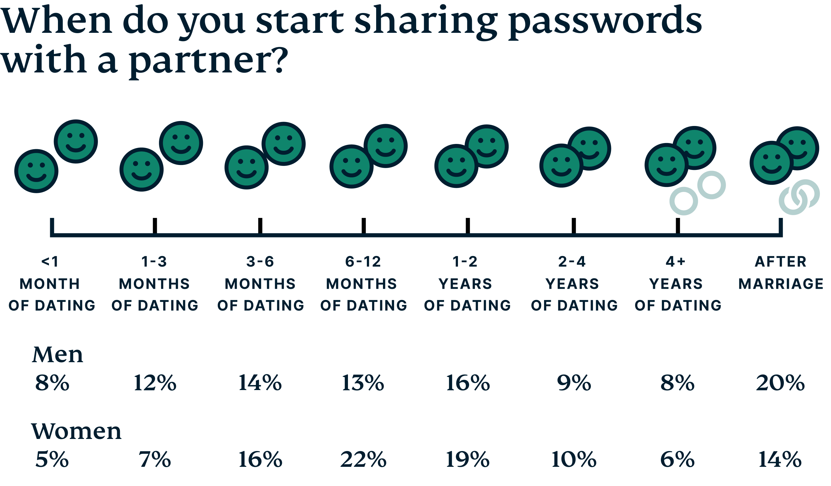 Women don’t share passwords as freely in the very early stages of a relationship, but overtake men significantly in the later parts of the first year of dating.