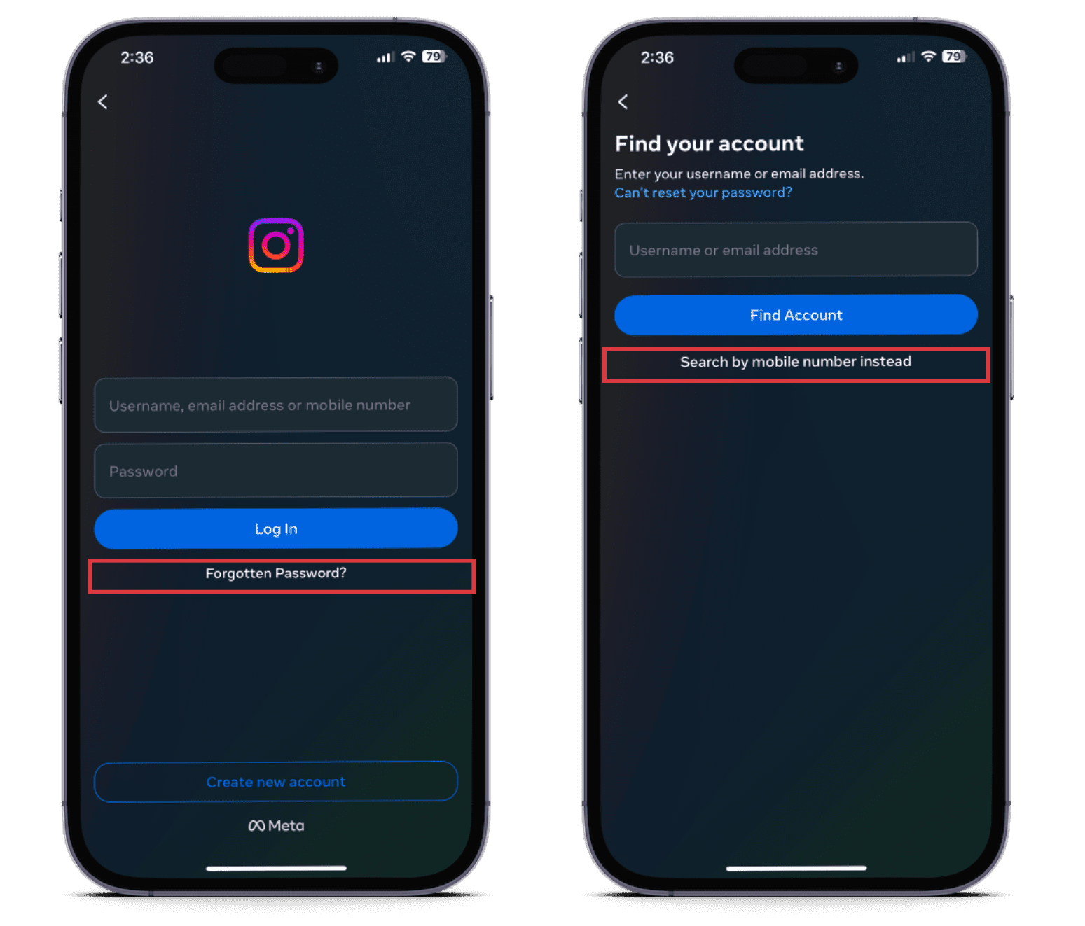 - Tippen Sie auf dem Anmeldebildschirm von Instagram auf Passwort vergessen?