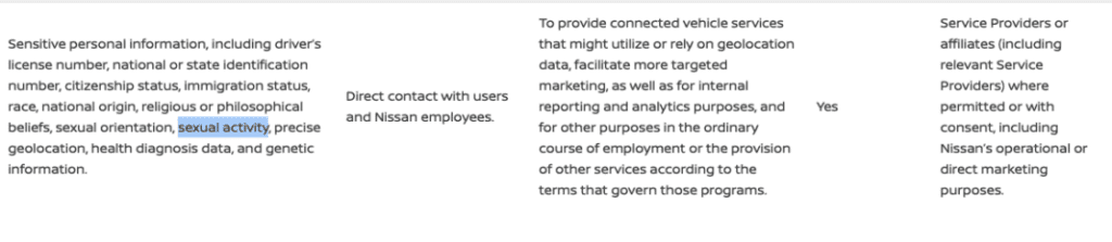 コネクテッドカーの世界における「同意」という概念もまた、幻想に満ちていることが多いです。自宅で使うようなスマートホームデバイスとは異なり、運転は多くの人にとって必要不可欠なものです。企業は、ユーザーが車に乗る前にポリシーを読んで同意したと仮定して同意を回避したり、同意したとみなしたりすることがよくあります。例えばスバルは、車内にいるだけで個人情報の使用や販売の可能性に暗黙的に「同意」したことになると述べています。