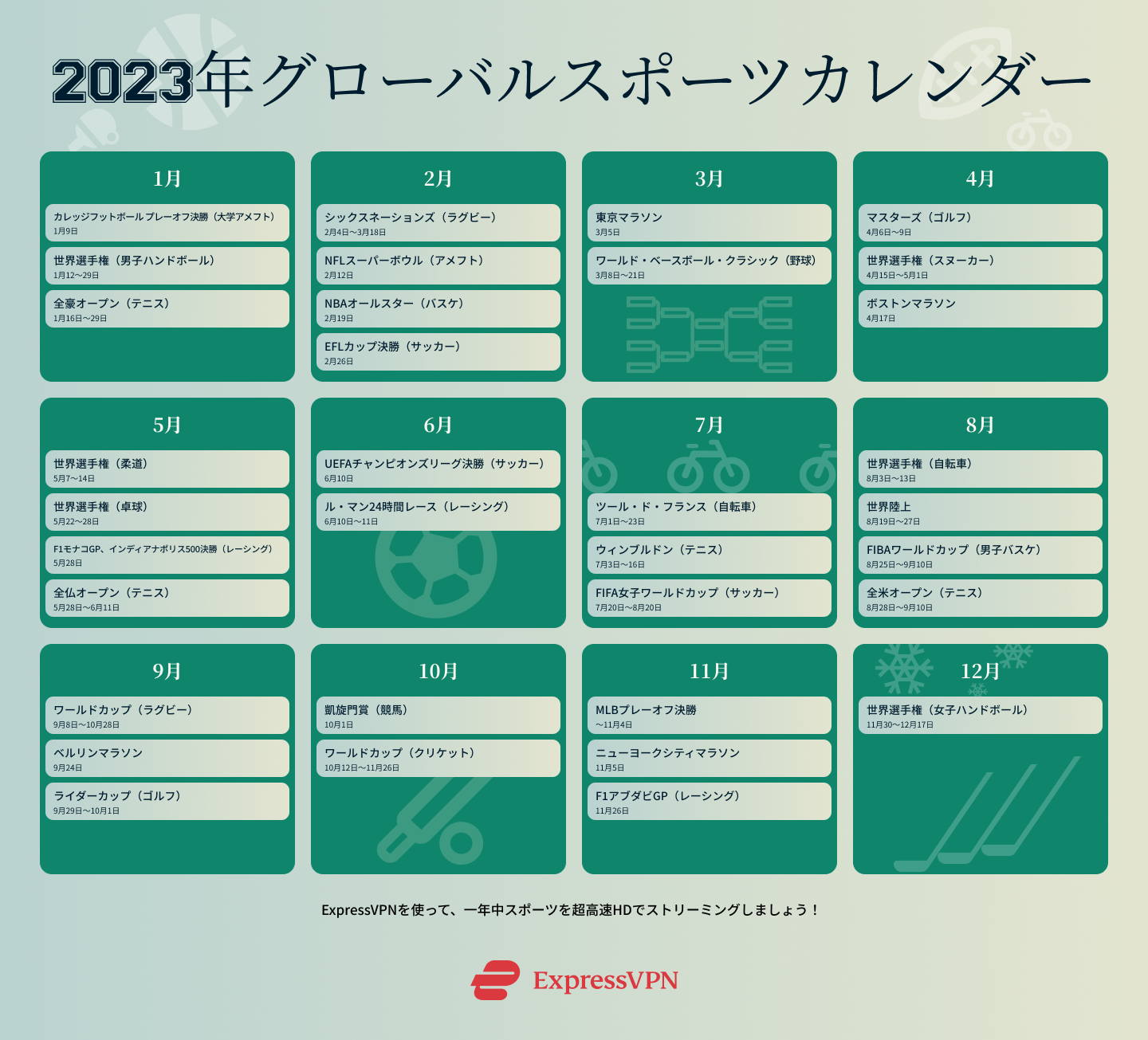 この他の主要なスポーツイベントは以下の表でチェックできます。2023年も見逃せないスポーツが盛りだくさんの1年、ExpressVPNと一緒に、ストリーミングを楽しみましょう!