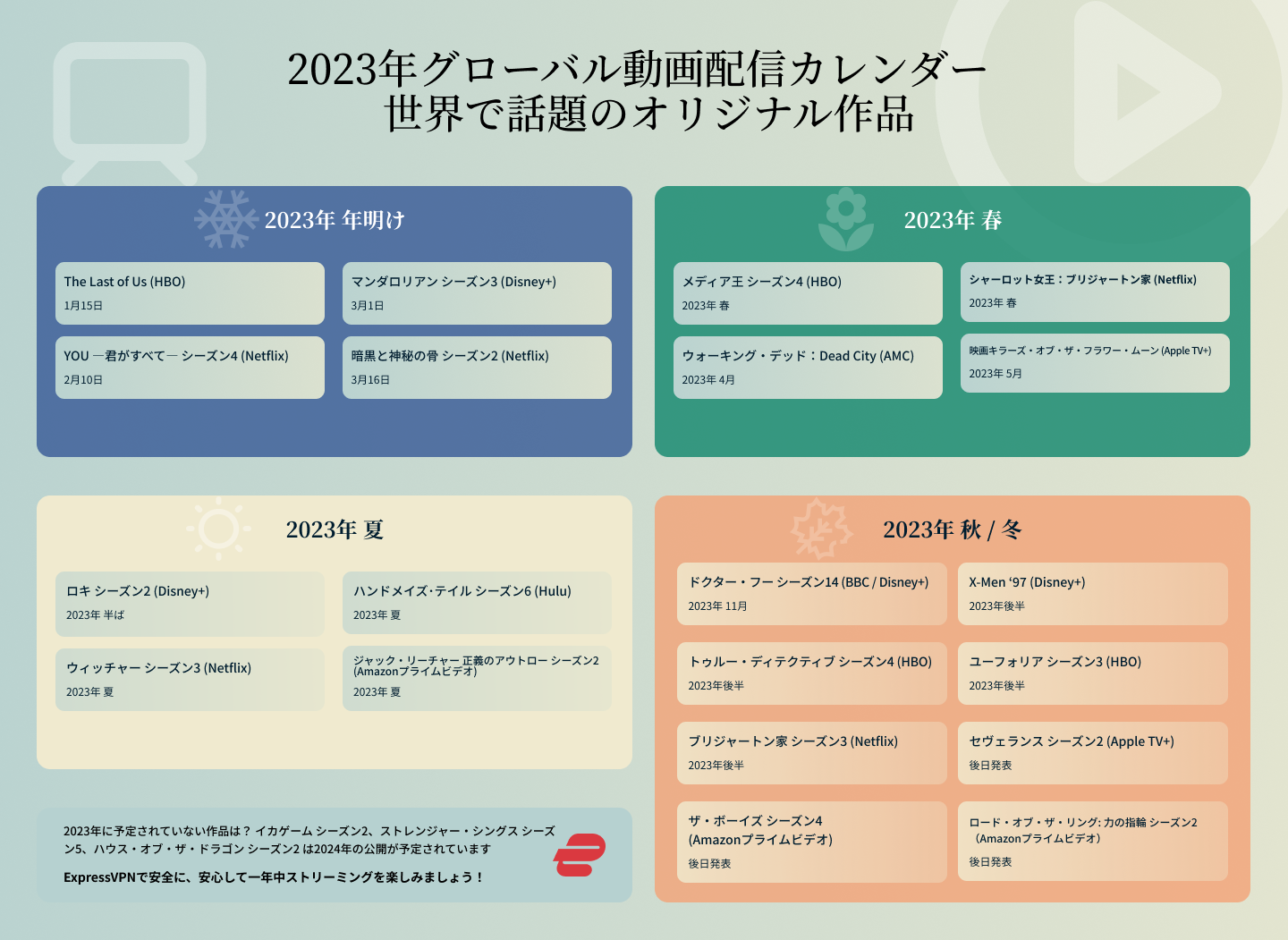 2023年、動画配信各社がリリース予定のオリジナル配信作品や、スポーツイベントを楽しみにしているストリーマーの皆さんのために、ExpressVPNでは一年分のおすすめコンテンツを一覧にしました。ぜひ参考にしてください。