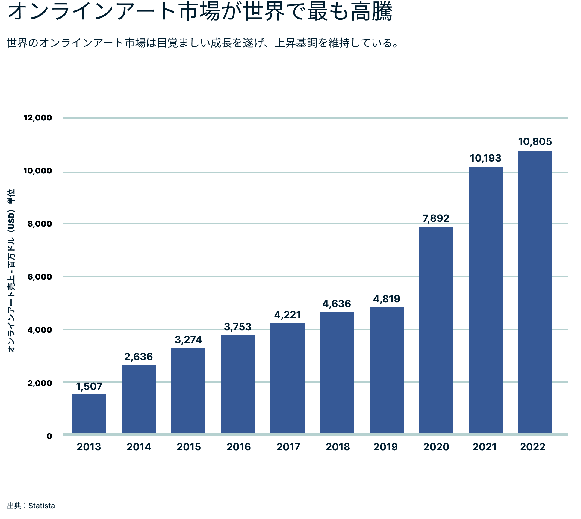 美術品への投資は、ポートフォリオを多様化し、高いリターンを生み出す有益な方法でもあります。2022年だけでも、美術品は他の実物資産を凌駕し、29%という素晴らしい急上昇を記録しました。また、美術品の販売はオンライン販売を通じて108億米ドルという驚異的な価値を生み出しています。