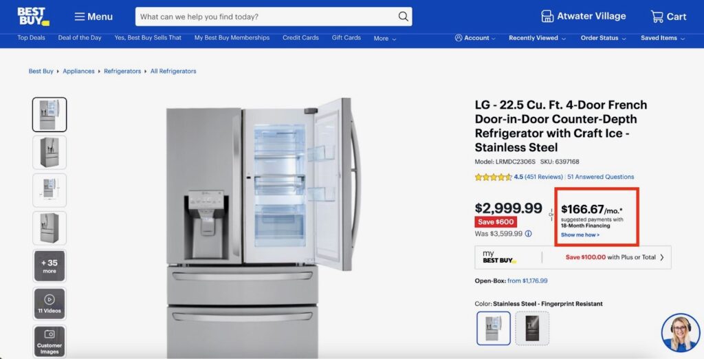 顧客がためらっている場合、もっと安価なオプションを提供すると、まだ売上を確保できます(価格重視の買い物客には特にそうです)。値段の高いアイテムへの分割払いプランが、この戦略の良い例として機能します。例えば、顧客が新しい冷蔵庫に3,000米ドルを前払いすることをためらっている場合、月々167米ドルの分割払いを選択できると、もっと管理しやすく、魅力的に思えます。
