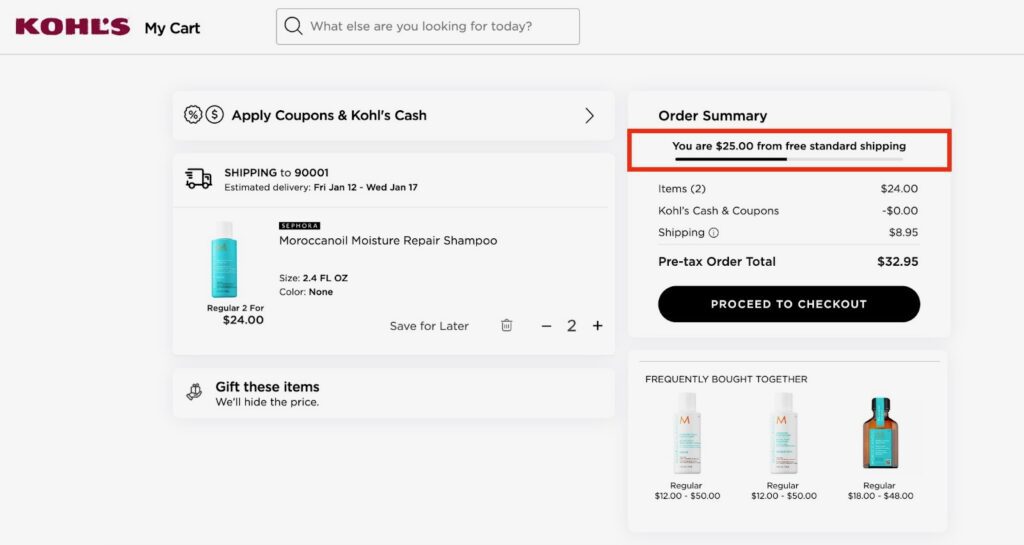指定金額以上の注文に対して、送料無料や速達便を提供すると、資格を得るために顧客が買い物カゴの製品を増やす気にさせます。多数のオンラインファッション、食料品、フードデリバリーサービスがこの戦略を利用して、設定金額以上の注文に対して送料無料を提供しています。顧客が買い物カゴに追加のアイテムを加えるように導くことが多く、送料無料特典を得るために何の気なしにお金をもっと使います。