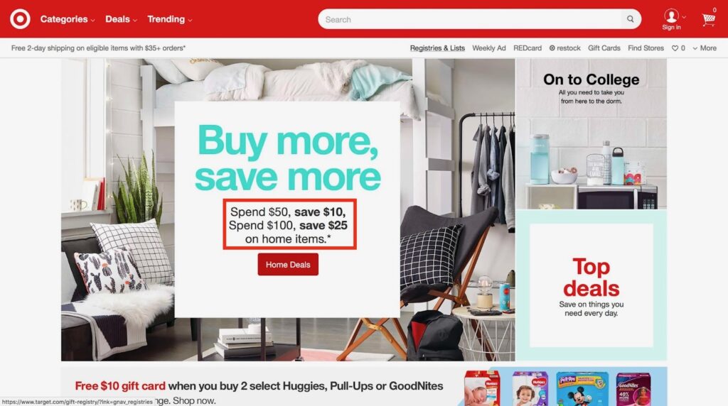 割引用プロモーションコードを提供したり、購入に無料アイテムをつけると、追加でお金を使うことを促すことができます。オンラインのファッション小売業者とオンラインの食料品店はプロモコードを使用することが多く、顧客が購入を完了させたり、特定の金額まで出費するように引き込みます。