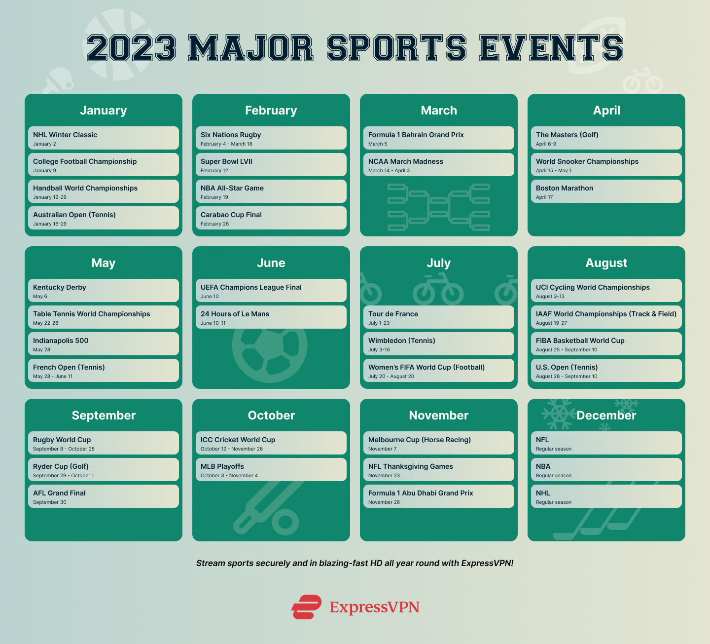 ExpressVPN is your ticket to streaming every major sports event securely and in blazing-fast HD, all year round. Want even more? Check out our roundup of the week's best sports events, updated twice weekly with everything sports fans need to watch their favorite teams and events.