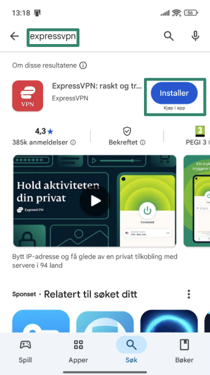 2. Søk etter «ExpressVPN» og installer appen på enheten din.
