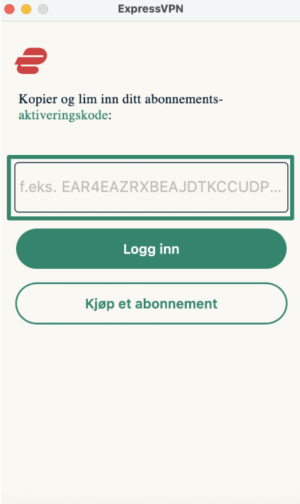 3. Oppgi aktiveringskoden din for å logge inn på ExpressVPN. Du finner koden i kontrollpanelet ditt når du logger inn på webportalen hos ExpressVPN.