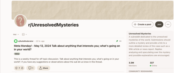 Comunidades como o r/UnresolvedMysteries no Reddit demonstram como as plataformas de mídia social transformam crimes reais de uma atividade solo em uma investigação colaborativa. Com mais de 33 milhões de membros, este subreddit dedica-se a analisar e especular sobre mistérios não resolvidos.