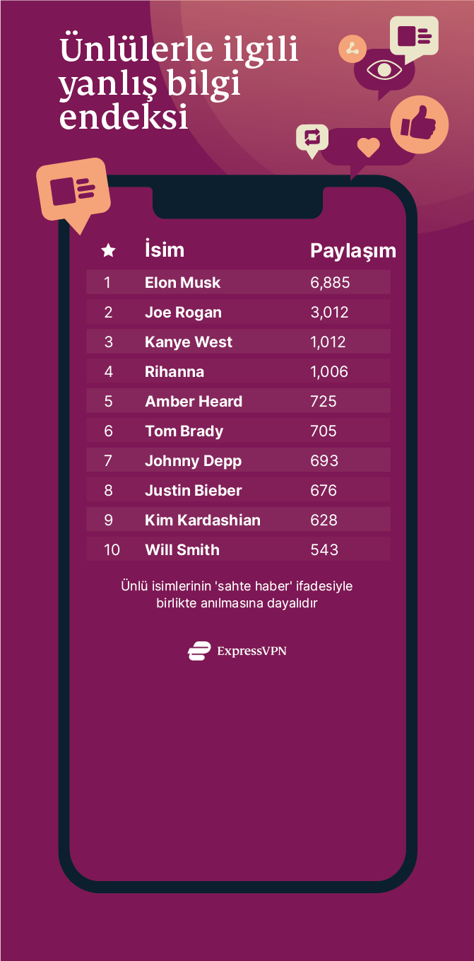 Aktör Will Smith ve şarkıcılar Rihanna ve Taylor Swift, top 10 listemizdeki son üç sırada yer alıyor. Smith'in Oscar ödülleri töreninde Chris Rock'ı tokatlaması ve Rihanna'nın ilk çocuğunu doğurması, yanlış bilgiler için bir ilham kaynağı oldu veya en azından soruların ortaya çıkmasına neden oldu. Swift ise dünyanın en büyük pop yıldızı olmaya devam etti ve özel jetini kullanım şeklinden şarkılarını kendi yazıp yazmadığına kadar her konuda eleştiri oklarının hedefi oldu.