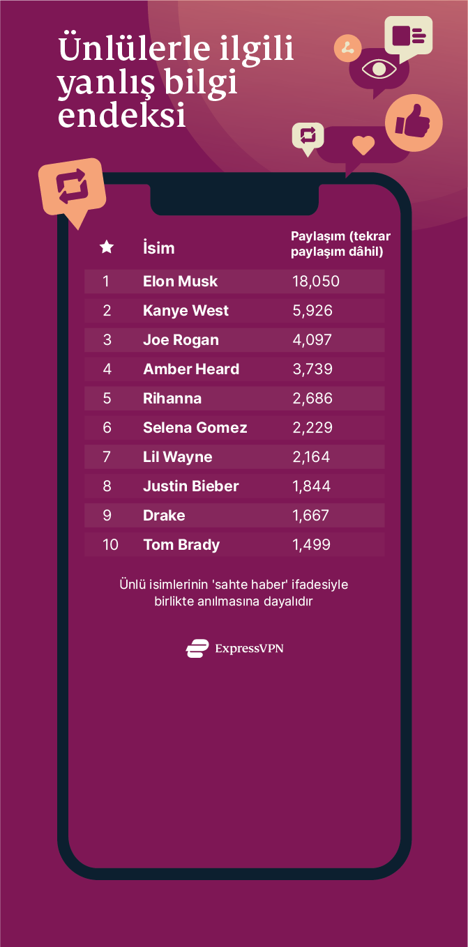 Bu çalışma, internette en çok aratılan ünlüleri, isimlerinin Ocak - Ekim 2022 arasında “sahte haber” ifadesiyle birlikte ne sıklıkta geçtiğini öğrenmek için sosyal dinleme kullanarak inceledi. Sonrasında bu ünlüleri; paylaşım sayısı, tekrar paylaşım dâhil paylaşım sayısı, görüntülenme, erişim ve etkileşim dâhil birçok faktöre bağlı olarak sıraladık.
